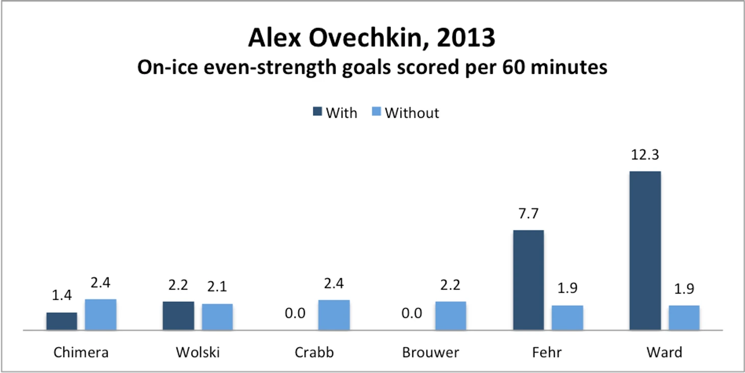 Интересную статистическую выкладку публикует Нил Гринберг. За первую половину сезона в тройке с Александром поиграло 6 разных фланговых нападающих – от Чимеры и Вольски до Крэбба, Брауэра, Фера и Уорда. Комфортнее всего, судя по результату, Овечкину играется с Войтеком, но именно его отправляют в запас, когда «Вашингтон» приобретает Аарона Волпатти.