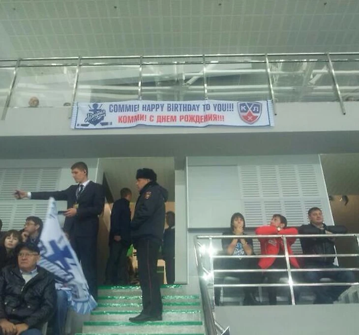 Второй же плакат посвящен конкретному хоккеисту – Майку Коммодору, недавно отметившему день рождения и в среду впервые вышедшему на лед «Фетисов-Арены». На такое отношение канадец ответил заброшенной шайбой к 30-й минуте матча и вполне понятным словом «Splaciba» в твиттере.
