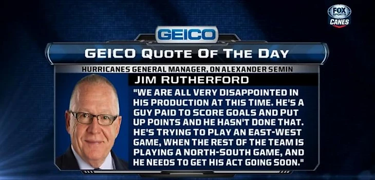 А вот слова из интервью Рутерфорда, которые не попали в телевизионную плашку, но заслуживали там быть: «Мне кажется, проблема в его настрое и желании стараться только тогда, когда приходит время контрактного сезона. Он, пожалуй, самый талантливый игрок команды, и когда Семин хочет играть, он делает это. Не знаю, что ему еще нужно, но кому-то нужно в этом разобраться. Особенно ему самому».