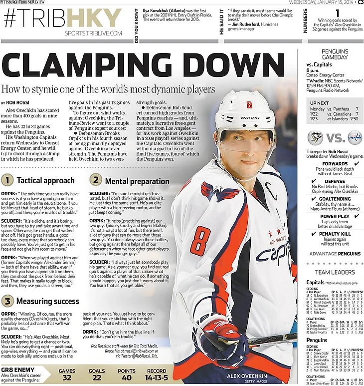 Перед матчем с «Кэпиталс» питтсбургское издание Tribune Review мучило Роба Скудери и Брукса Орпика вопросами об Овечкине и даже посвятило этому целую страницу, но остановить капитана «Кэпиталс» защитникам не удалось.
