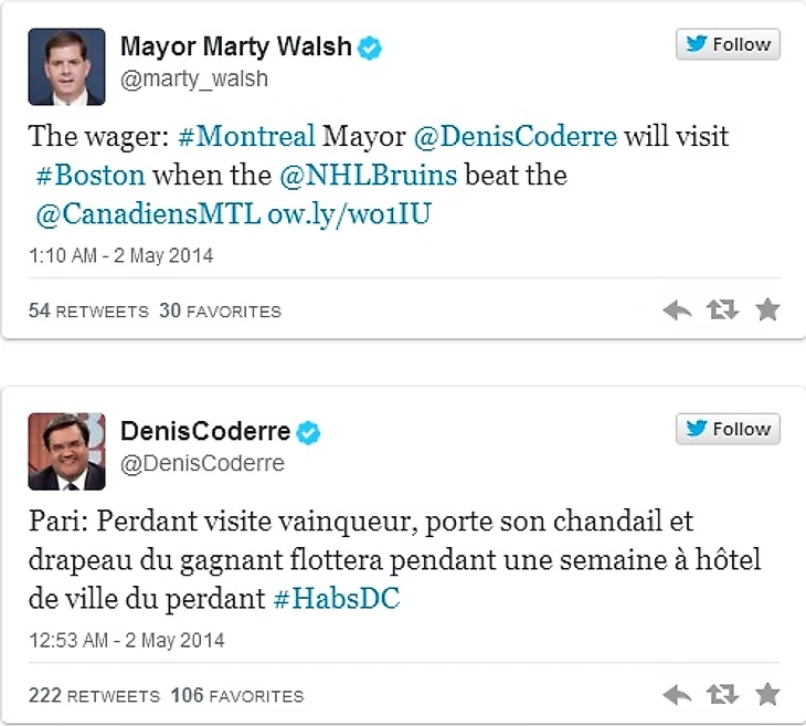 Мэры Монреаля и Бостона Денис Кодерр и Марти Уолш поспорили на результат серии «Канадиенс» – «Брюинс». В случае победы одной из команд флаг ее города будет установлен на здании Сити Холла проигравшего города.