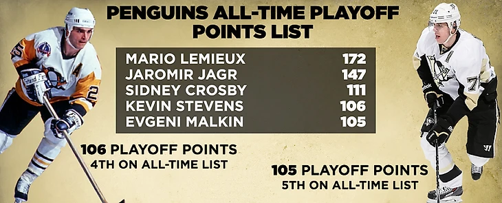 Евгений Малкин забил 40-й гол и набрал 107-е очко в плей-офф. По этому показателю он обошел Кевина Стивенса – четвертого бомбардира в истории «Питтсбурга». Перед началом серии этот список выглядел так.