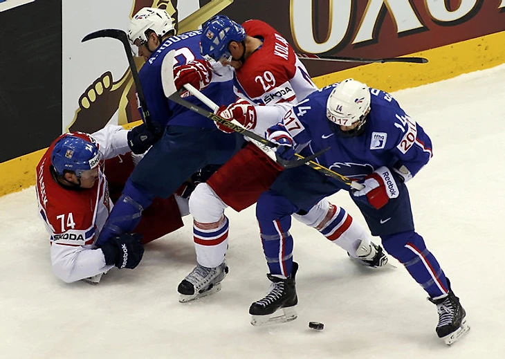 Совершенно кошмарным выдалось для чехов начало матча с Францией. Сперва бесхитростный наброс Жаниля превратился в гол, задев по дороге клюшку Трея и очень удачно отскочив в ворота от черенка клюшки Дерозье. Тут же чудом не забил Ягр, Червенка чуть погодя не реализовал выход один на один с Арди, посыпались удаления – и французы удваивают счет. А спустя 34 секунды – утраивают.