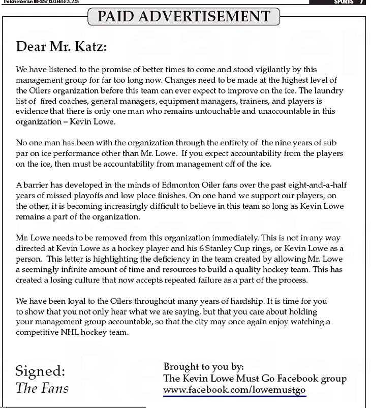 Болельщики «Эдмонтона» выкупили рекламную полосу газеты Edmonton Sun (более 5 тысяч долларов) и обратились к владельцу клуба с просьбой уволить Кевина Лоу.