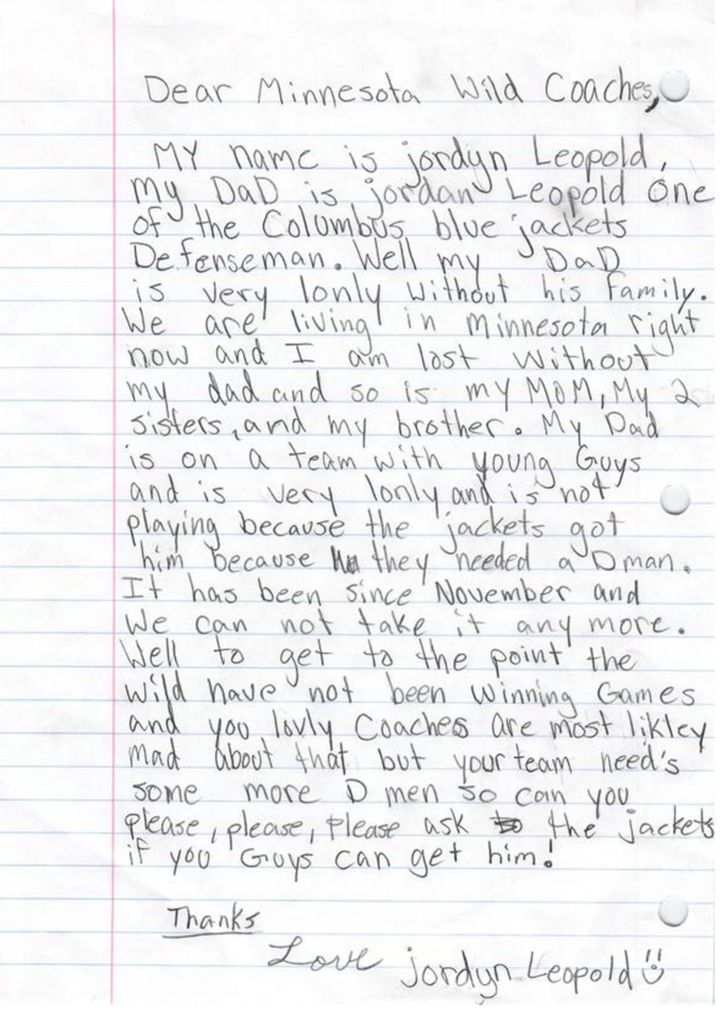 22.51 Краткое содержание письма: Джордин (а семья Леопольда живет в Миннесоте) очень скучает по папе, страдающему и чувствующему себя одиноким в компании «мундиров»-«малолеток», и просит штаб «Уайлд» выдрать его из лап злобного «Коламбуса», который прикупил Джордана в ноябре ввиду кучи поломок у целого ряда игроков, но играть все равно не дает. Тем более что «Миннесота» постоянно проигрывает (видимо, письмо было написано где-то в начале февраля).