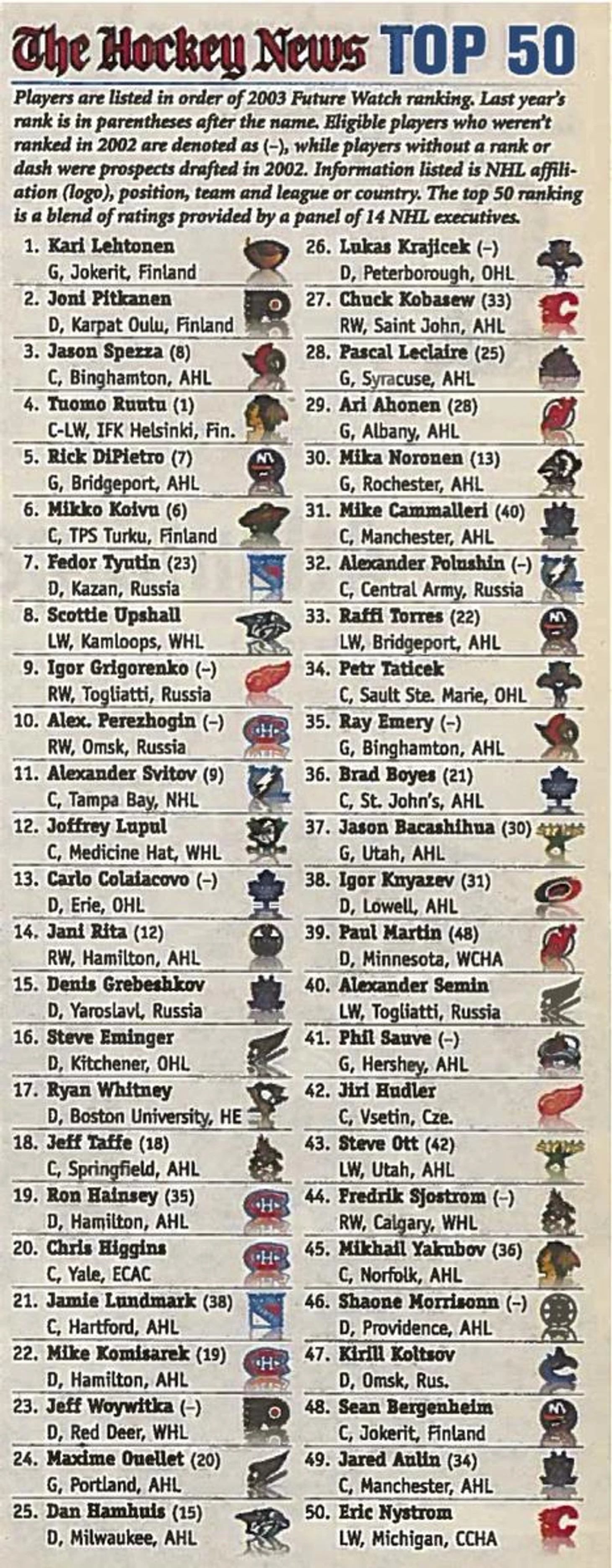 Топ-50 лучших юниоров мира по версии The Hockey News в 2003-м. Семин – 40-й, Майк Каммаллери – 31-й, Пережогин – 10-й.