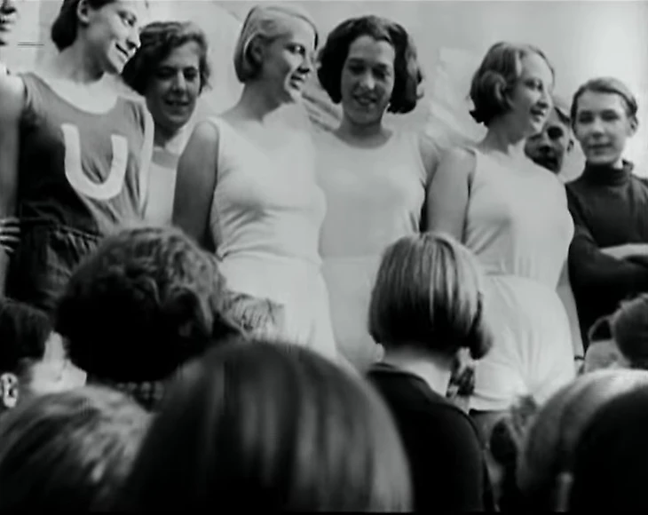 Кадр из фильма «Куле Вампе или Кому принадлежит мир?» (1932 год, «Прометей фильм» / Prometheus Film, режиссер Златан Дудов, сценаристы Бертольт Брехт, Эрнст Оттвальт, Златан Дудов). Спортсменка FSU / Freie Sportunion с буквой «U»