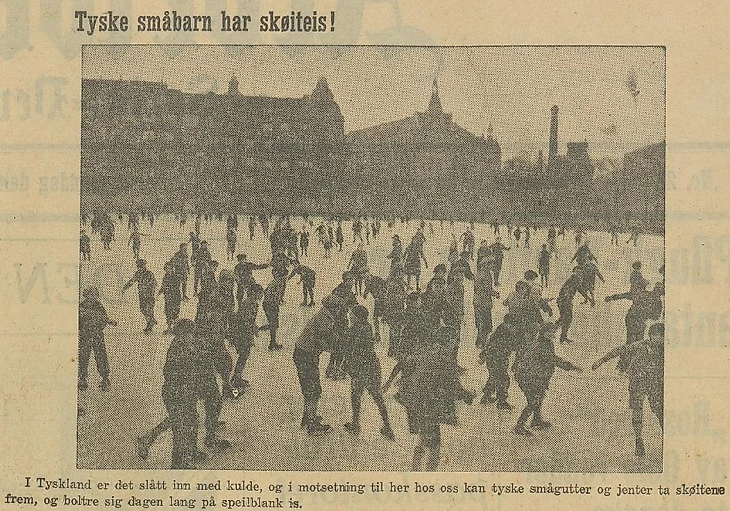 Январь 1932 года. Берлин. «Немецкие малыши могут кататься на коньках! В отличие от здешних мест в Германии холодно, поэтому немецкие мальчики и девочки могут взять свои коньки и целый день кататься по зеркально чистому льду» (газета «Арбайтеръбладет» (Осло) № 23 за 25 января1932 года)