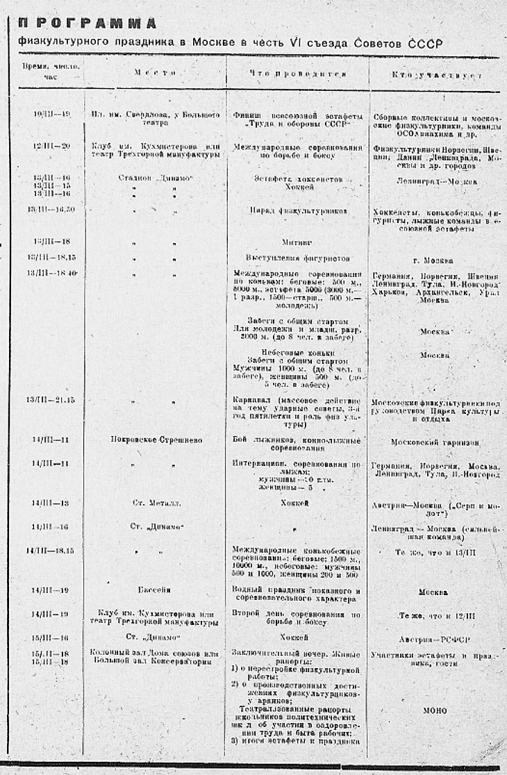 Март 1931 года. Программа физкультурного праздника в честь VI съезда Советов СССР (ленинградский физкультурный журнал «Спартак» № 11-12 за 28 февраля 1931 года)