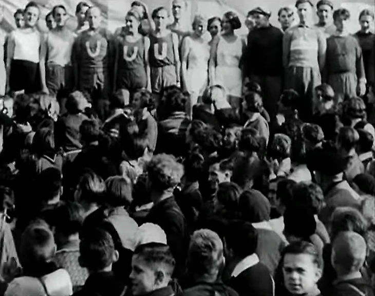 Кадр из фильма «Куле Вампе или Кому принадлежит мир?» (1932 год, «Прометей фильм» / Prometheus Film, режиссер Златан Дудов, сценаристы Бертольт Брехт, Эрнст Оттвальт, Златан Дудов). Атлеты FSU / Freie Sportunion с буквой «U»