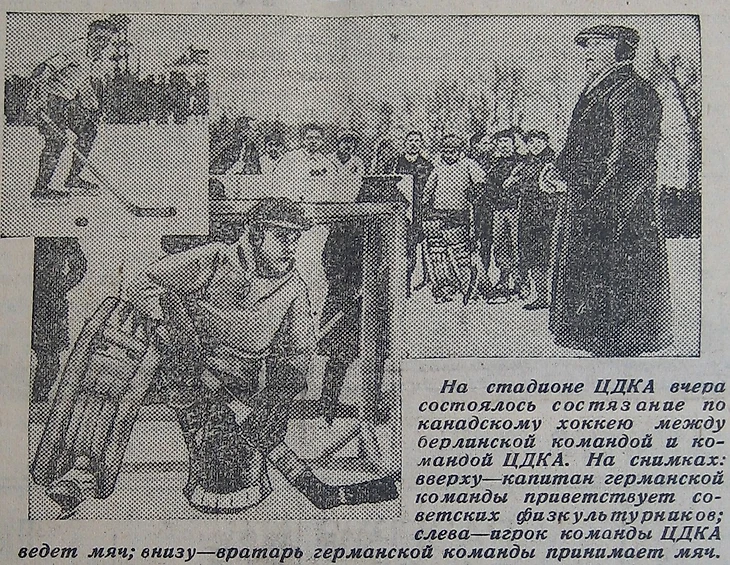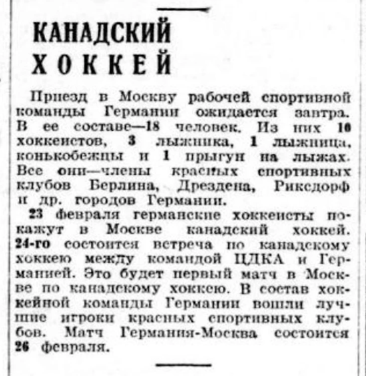 Согласно информации из газеты «Вечерняя Москва» № 42 за 21 февраля 1932 года к нам приехала сборная Германии Комитета за восстановление единства рабочего спорта «Роте Шпортайнхайт»: «Приезд в Москву рабочей спортивной команды ожидается завтра. В ее составе - 18 человек. Из них 10 хоккеистов, три лыжника*, одна лыжница**, [трое] конькобежцы и один прыгун на лыжах***. Все они - члены красных спортивных клубов Берлина, Дрездена, Риксдорфа и других городов Германии. 23 февраля германские хоккеисты покажут в Москве канадский хоккей. 24-го состоится встреча по канадскому хоккею между командой ЦДКА и Германией. Это будет первый матч в Москве по канадскому хоккею. В состав хоккейной команды Германии вошли лучшие игроки красных спортивных клубов. Матч Германия - Москва состоится 26 февраля».