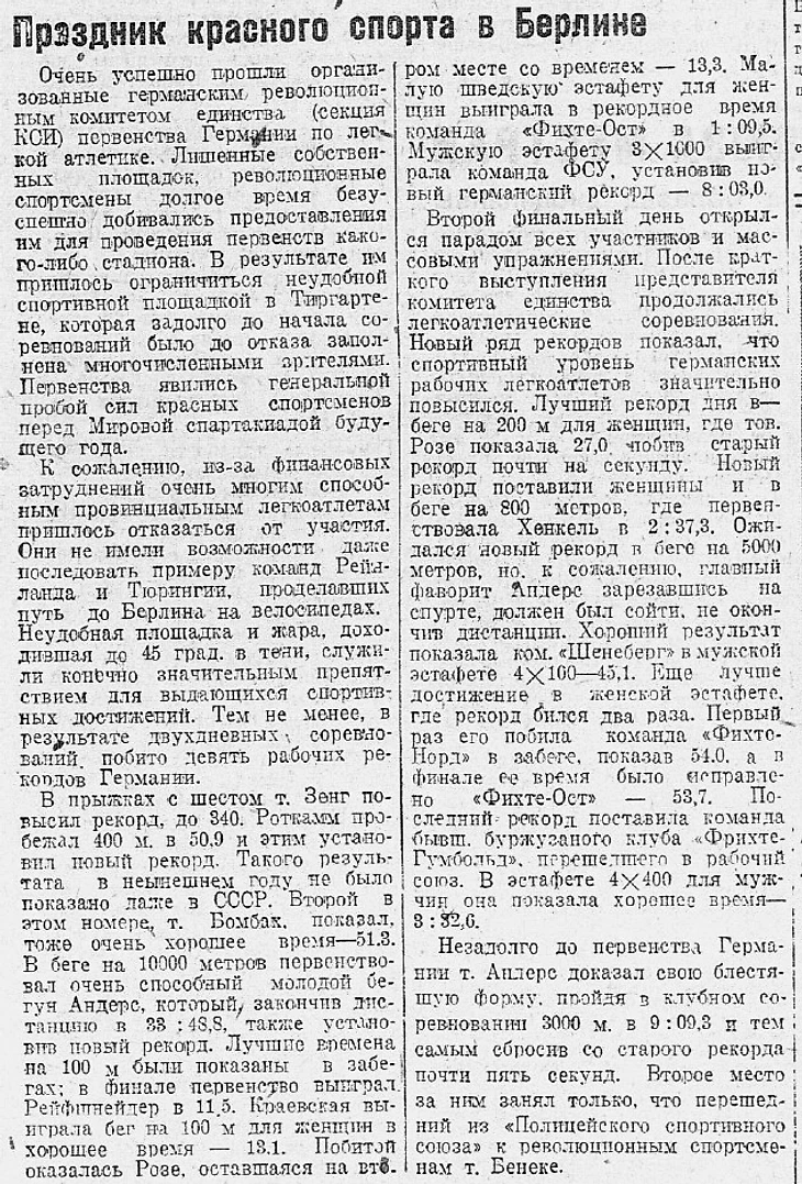 Материал о чемпионате Германии по легкой атлетике («Роте Шпортайнхайт») с информацией о победе команды ФСУ (FSU / Freie Sportunion) в мужской эстафете 3 х1000 м с новым рекордом Германии (газета «Спартак» (Ленинград) № 2 (35) за 26 августа 1932 года)