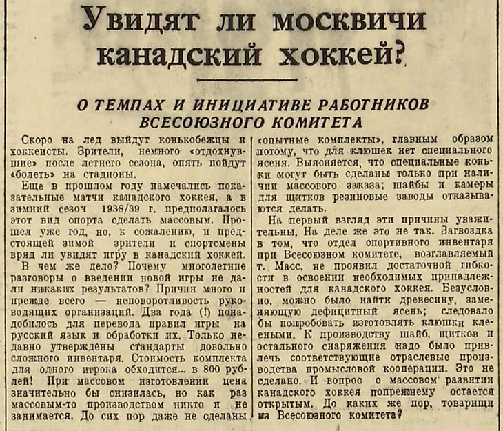 «Увидят ли москвичи канадский хоккей?» (газета «Красный спорт» № 155 за 15 ноября 1938 года)