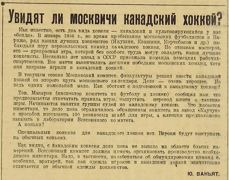 «Увидят ли москвичи канадский хоккей?» (газета «Красный спорт» № 172 за 27 декабря 1937 года)