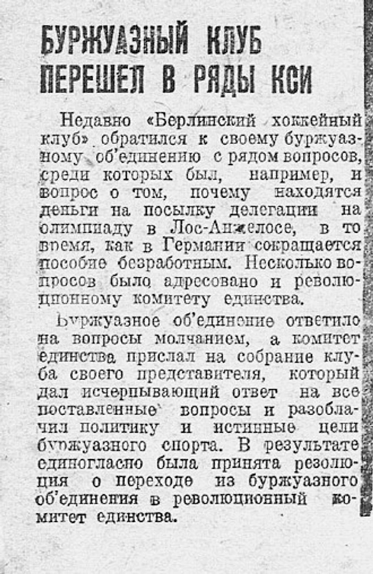 И еще не известно сколько раз могли бы приехать «красные» хоккеисты из Германии, если бы не приход в ней к власти крайне правых. Тем более, что потенциал для развития у «Роте Шпортайнхайт» имелся. В органе Ленинградского областного совета физкультуры газете «Спартак» (№ 13 за 6 октября 1932 года) появилась заметка о переходе «Берлинского хоккейного клуба»* (Berliner Hockey-Club) под юрисдикцию «Красного единства». Похожая заметка была опубликована и несколькими днями ранее (№ 12 (45) за 30 сентября 1932 года).