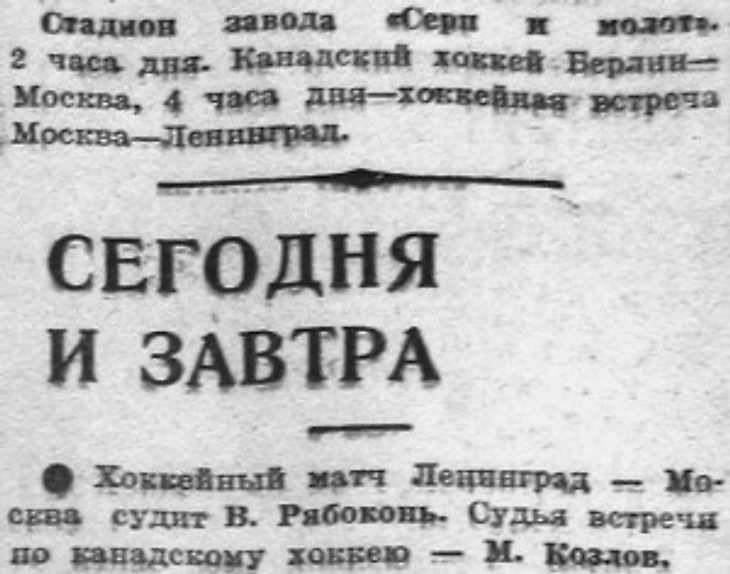 «Стадион завода «Серп и молот». 2 часа дня. Канадский хоккей Берлин - Москва, 4 часа дня - хоккейная встреча Москва - Ленинград. Хоккейный матч Ленинград - Москва судит В. Рябоконь. Судья встречи по канадскому хоккею - М. Козлов»