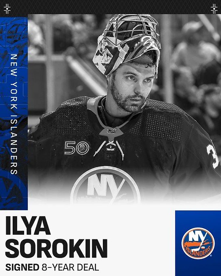 • У Ильи Сорокина был еще действующий контракт на год, но «Айлендерс» решили не ждать: продлили на 8 лет с ежегодной зарплатой в 8,25. А заодно еще и Варламова на 4 года продлили.