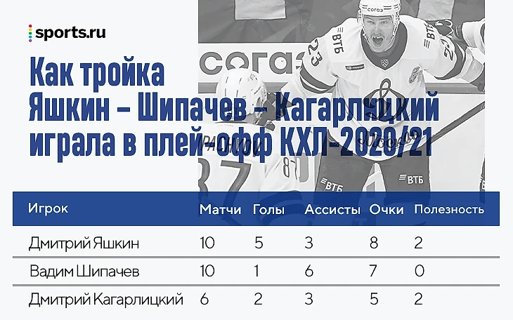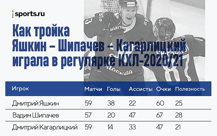 В сезоне-2020/21 тройку Яшкин – Шипачев – Кагарлицкий все вокруг называли лучшей в лиге. Позже Яшкину пришлось опровергать стереотип, что на его хорошую статистику в России влиял именно Вадим. Он объяснял это так: оба работали друг для друга, но и отдельно от Шипачева Яшкин способен показывать классную результативность. Доказывал все это уже в СКА.