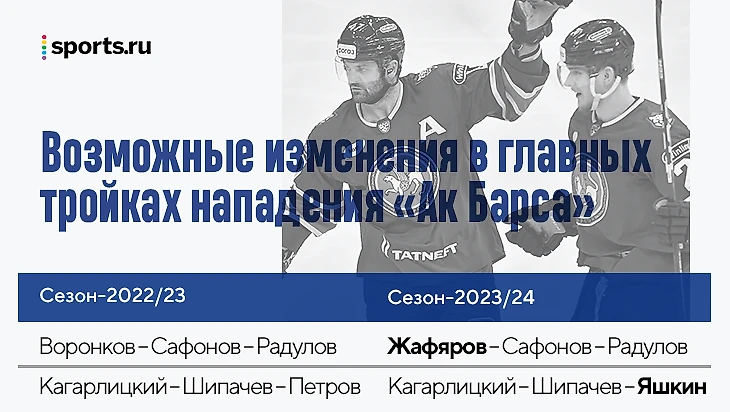 В межсезонье «Ак Барс» не только искал усиление для ведущих троек нападения, но и решал проблему ухода Воронкова. Летом тот отправился в «Коламбус» на двухлетний контракт. По первым тренировкам «Ак Барса» можно сделать вывод, что в тройку к Радулову и Сафонову добавится Жафяров. Яшкин же заменит в другой тройке Петрова, хотя тот остался в команде еще на год.