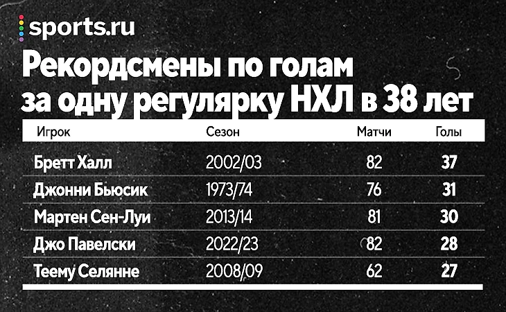 Рубеж в 38 лет – интересная отсечка в карьере забивных форвардов в НХЛ. Горди Хоу в тот сезон больше ассистировал – всего 25 голов. Халл больше никогда не повторял подобную цифру и потом сбавил. Зато Селянне сохранял уровень и позже забивал еще больше – 31 шайбу. Если Овечкин хотя бы подберется к показателю Халла, то рекорд Гретцки станет совсем близко.