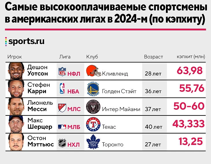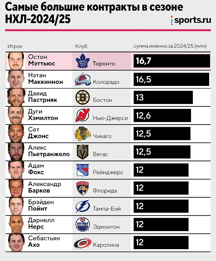 Эти цифры поражают только в формате НХЛ. Если брать другие топовые лиги Америки, то хоккей среди них бедный родственник. Просто посмотрите кэпхиты самых богатых спортсменов под конец 2024-го, когда Мэттьюс будет официально самым высокооплачиваемым в НХЛ.