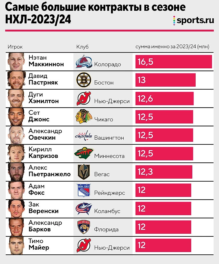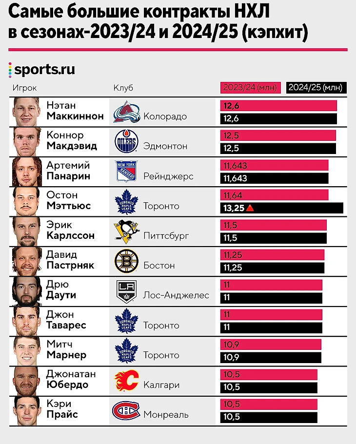 После нового контракта Остон резко поднимется – и сразу на первое место. Год назад Нэтан Маккиннон подписал такой контракт, по которому в первые сезоны будет получать не менее 16 млн, но в сезоне-2024/25 Мэттьюс его обойдет. Хотя через год лидер «Колорадо» снова будет выше усов.