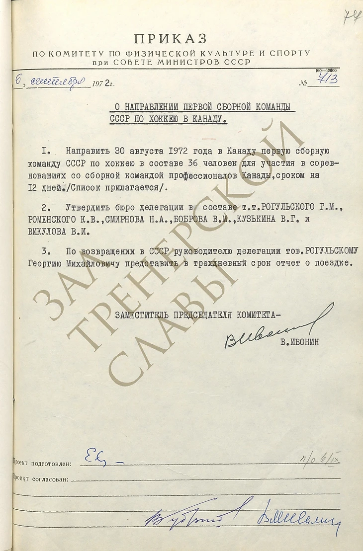 Суперсерия-72: оригинал приказа на выезд в Канаду