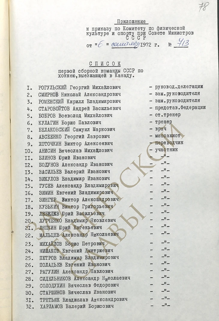 Хоккейная Суперсерия 1972 года, безусловно, входит в число главных событий отечественного спорта. И у нас, и за океаном про неё написаны книги, сняты документальные и художественные фильмы, регулярно проводятся памятные мероприятия. Но, кажется, никто не публиковал и не печатал приказ на выезд сборной СССР в Канаду. Смотрите. Каждая фамилия – эпоха! А лично мне очень приятно видеть в списке моего старшего друга и наставника Виктора Алексеевича Хоточкина.