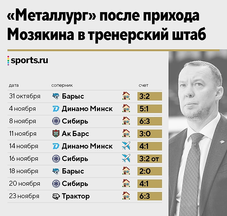 Насколько он поменял оригинальные установки, сказать сложно, но нынешнюю серию не стоит связывать в первую очередь с новым тренером. Хотя бы потому, что на выезд Мозякин не ездил с командой – в связи с очень приятными хлопотами. Да и объективно в последних 9 матчах у «Магнитки» не было топ-соперников – даже «Ак Барс» в его нынешнем состоянии совсем не тот.