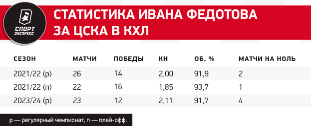 Когда летом москвичи анонсировали контракт с Федотовым, устроив самую загадочную и мрачную пресс-конференцию межсезонья, главный тренер Сергей Федоров надеялся, что Иван вернется в тонус за три месяца регулярки. Прямая цитата звучала так: «В декабре, думаю, мы должны будем увидеть Ивана, который здорово играет в воротах ЦСКА и сборной». Игра за сборную останется несбывшейся мечтой — на Кубок Первого канала Федотова не пригласили. Зато в клубе голкипер постепенно выходит на прежний уровень. На паузу в чемпионате Федотов ушел с серией из трех побед подряд — над минским «Динамо», «Металлургом» и «Витязем», а в двух последних матчах пропустил лишь одну шайбу.