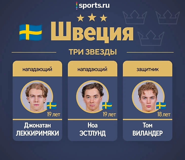 На помощь из глубины шведские нападающие вряд ли надеются. Помочь способен, пожалуй, только Аксель Сандин Пеликка – MVP прошлого ЮЧМ. Он техничен, обладает первоклассным броском и забил уже 9 шайб в 25 матчах взрослого чемпионата Швеции. А вот проспект «Ванкувера», 11-й пик драфта-2023 Том Виландер набрал в этом сезоне NCAA только 8 очков – свое он берет цепкостью и самоотверженностью, в матчах с топами это понадобится. У партнера Виландера по паре Маттиаса Хевелида – аналогичный результат в родном «Линчепинге».