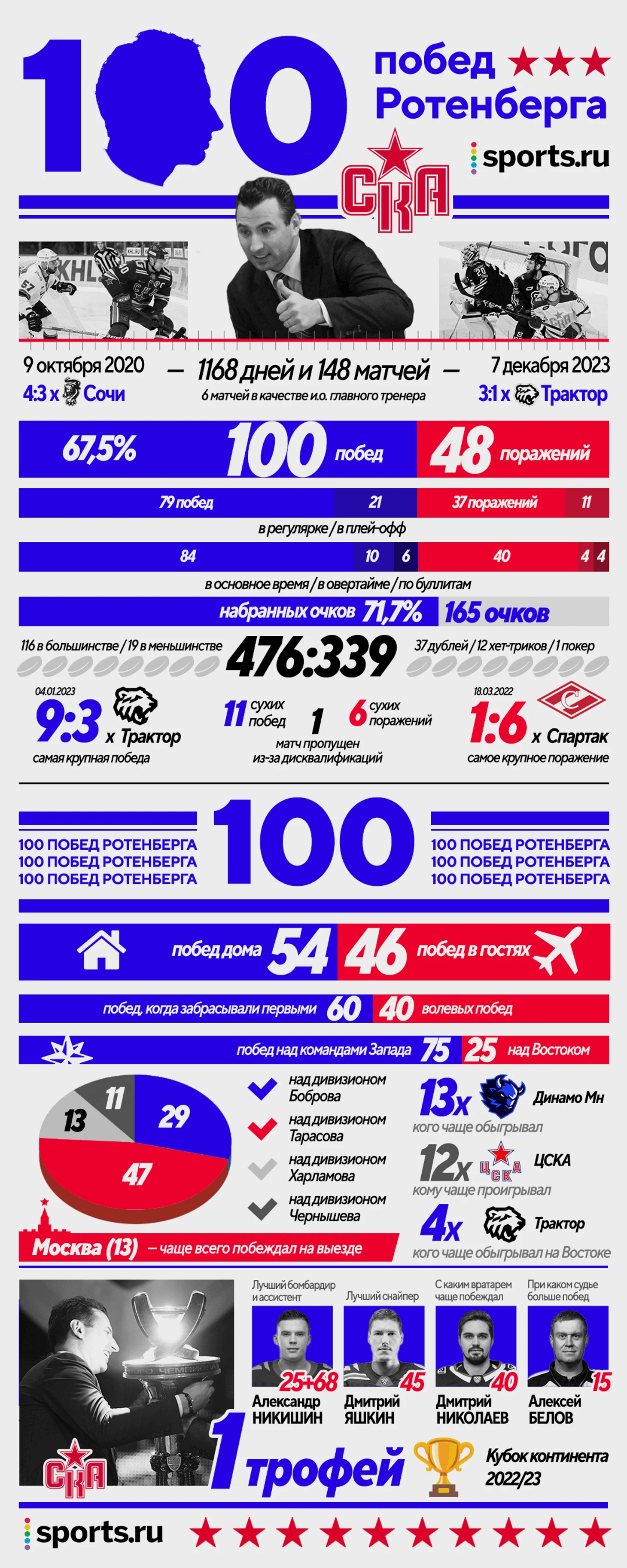 7 декабря СКА обыграл «Трактор» со счетом 3:1, и довольный Роман Ротенберг уехал в сборную – это была его сотая победа в качестве главного тренера КХЛ. Специалисту, начинавшему с мема про Йозе Марино, понадобилось для юбилея всего 148 матчей.