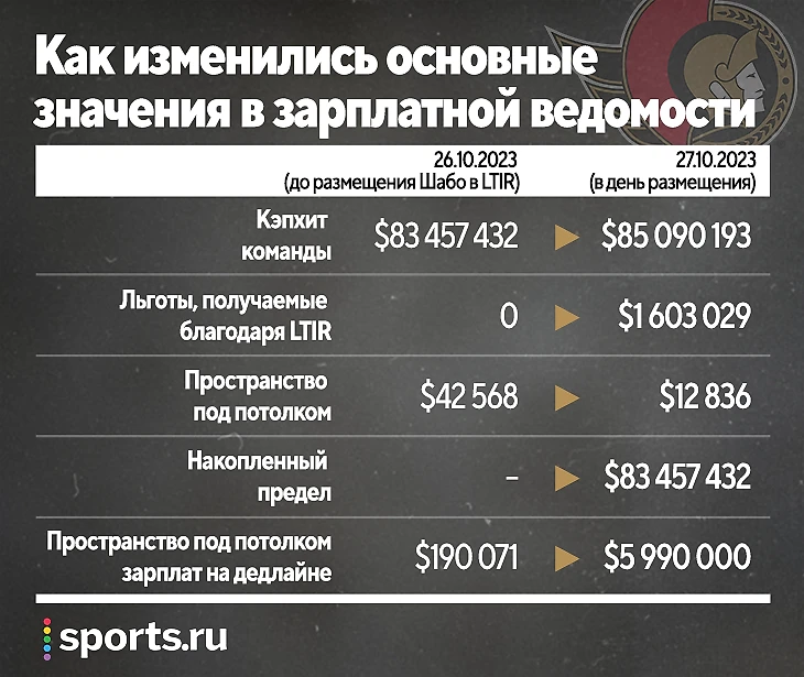 В итоге на данный момент, если Шабо останется в списке долгосрочно травмированных до конца сезона, «Оттава» сможет добавить в состав любое количество игроков с совокупным кэпхитом до 5,99 млн.  Например, усилить оборону, в которой три места из шести заняты новичками, Шоном Дурзи («Аризона», 1,7 млн) и Джастином Шульцем («Сиэтл», 3 млн). Или, например, одним Никитой Зайцевым («Чикаго», 4,5 млн). Или, в конце концов, подписать без лишних нервов контракт с Шейном Пинто, который не сыграет еще некоторое время из-за дисквалификации – он до сих пор находится в статусе ограниченно свободного агента.