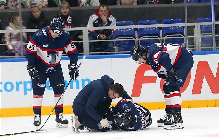 Василий долго лежал на льду и держался за колено. В итоге он покинул площадку только с помощью партнеров.