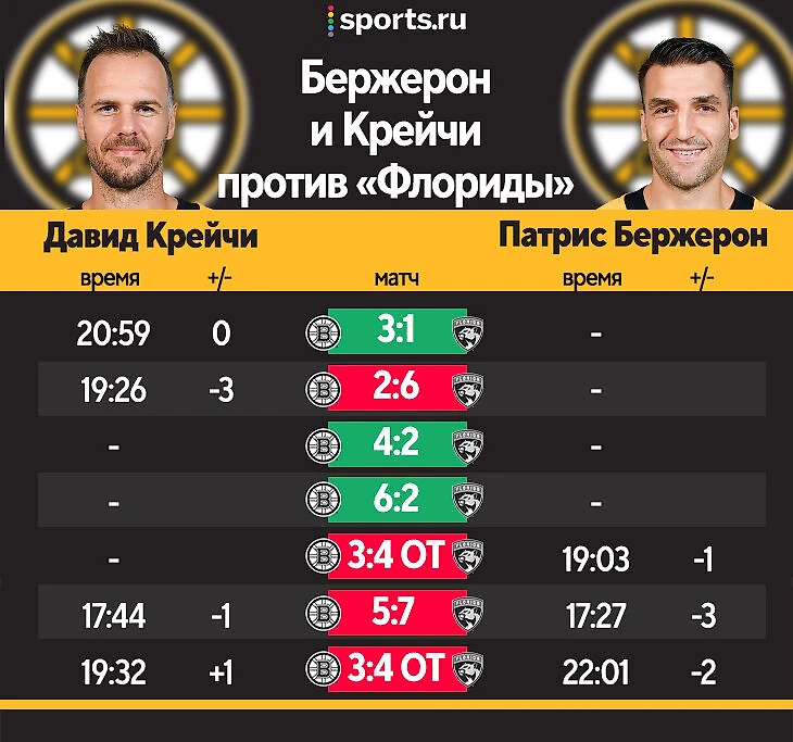 Итого – четыре матча. Из них «Бостон» проиграл три. Положительный «плюс-минус» у Крейчи был в одной игре. У Бержерона – ни в одной.