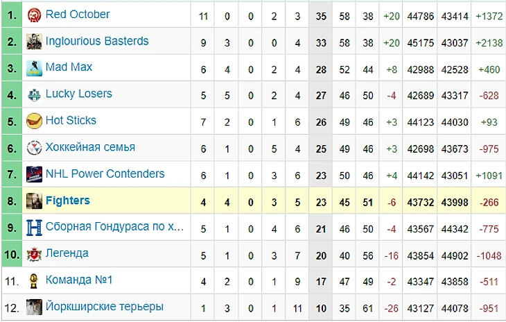 На 2 очка отстали Inglourious Basterds, одержавшие как и Red October наибольшее число побед в парах - 58. Хорошо выступают лидеры команды: o_kai - 5й (долго лидировал в общем зачете, но чуть сдал в последних турах), starryi - 30й, Alex 1988 - 31й.