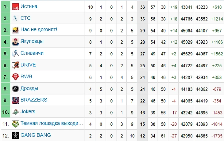 Столько же очков набрала и команда СТС, но заняла второе место так как меньше личных побед в парах, хотя и всего на одну. В команде 4 игрока в топ-100, а лидер команды dima 5555 занимает высокое 9-е место в ОЗ. Лидером по числу побед (13) является лисий володимир, занимающий 27 место и победивший во всех(!) матчах 2-го этапа. Очень круто!