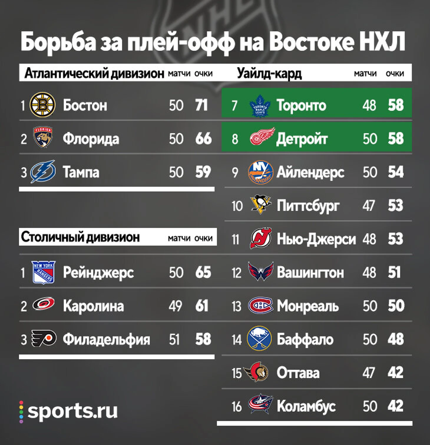 Да, с первыми двумя местами в каждом дивизионе вроде понятно, но на третьи хотя бы номинально претендуют по 3 и 5 команд, а на уайлд-кард, получается, сразу шесть. Ну и, например, «Баффало» с «Монреалем» располагаются не то чтобы в другой очковой галактике.