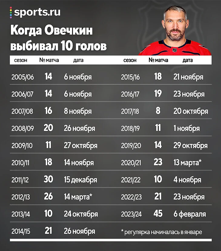 Это десятый гол Овечкина в сезоне – на это у него ушло аж 45 матчей и 4 месяца. Если отбросить локаутную и пандемийную регулярки, то так поздно он еще никогда не выбивал свою десятку.