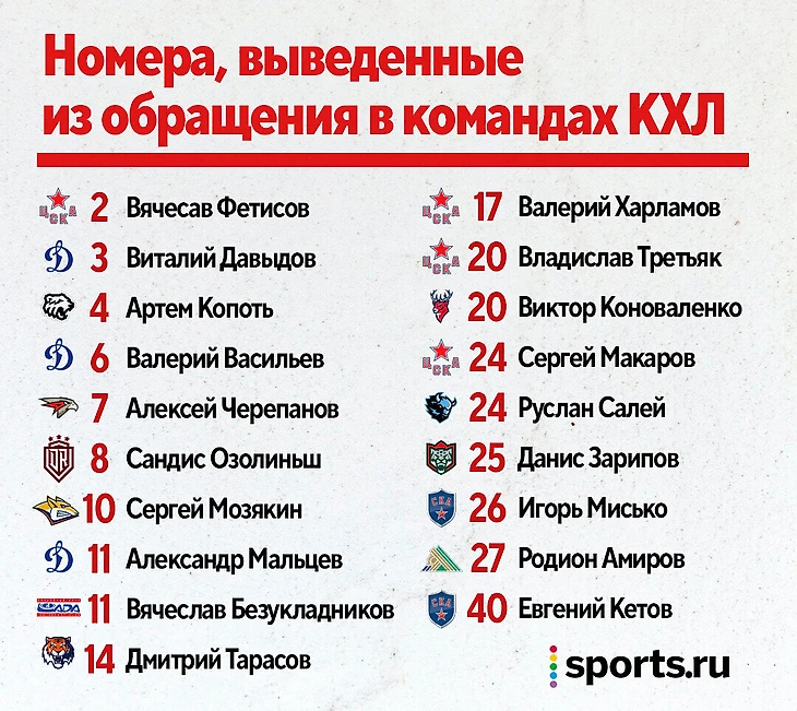 Многие клубы в знак уважения выводят из обращения номера, под которыми выступали важные для их истории игроки. В КХЛ эта практика только распространяется – изъяты номера всего 16 хоккеистов. Но в последние полгода торжественные процедуры происходят регулярно: «Ак Барс» вывел №25 Даниса Зарипова прямо на его глазах – во время прощального матча, СКА закрепил №40 за Евгением Кетовым, а «Салават Юлаев» и «Амур» увековечили память умерших Родиона Амирова и Дмитрия Тарасова.