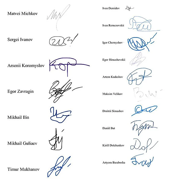 Обращение подписали 17 хоккеистов. Среди них выбранные на последнем драфте НХЛ Дмитрий Симашев («Локомотив»), Матвей Мичков (СКА, в аренде в «Сочи»), Даниил Бут («Локомотив»), Михаил Гуляев («Авангард»), Егор Заврагин («Югра», ВХЛ), Михаил Ильин («Северсталь»), Тимур Муханов («Северсталь»), Егор Римашевский («Динамо»).