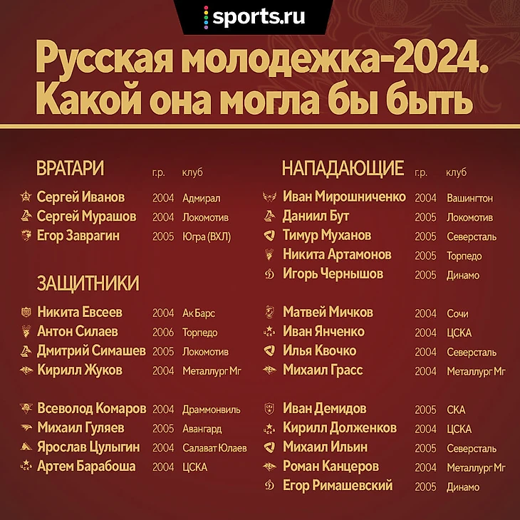 Их всего списка на МЧМ даже в теории точно не сыграют Мичков, Иванов, Коромыслов, Барабоша – к следующему турниру, даже если запрет снимут, им будет уже по 20 лет. Но большая часть подписавшихся хоккеистов наверняка бы попала в состав сборной России на последний МЧМ. Во всяком случае молодежка-2024 по версии Sports.ru выглядела так: