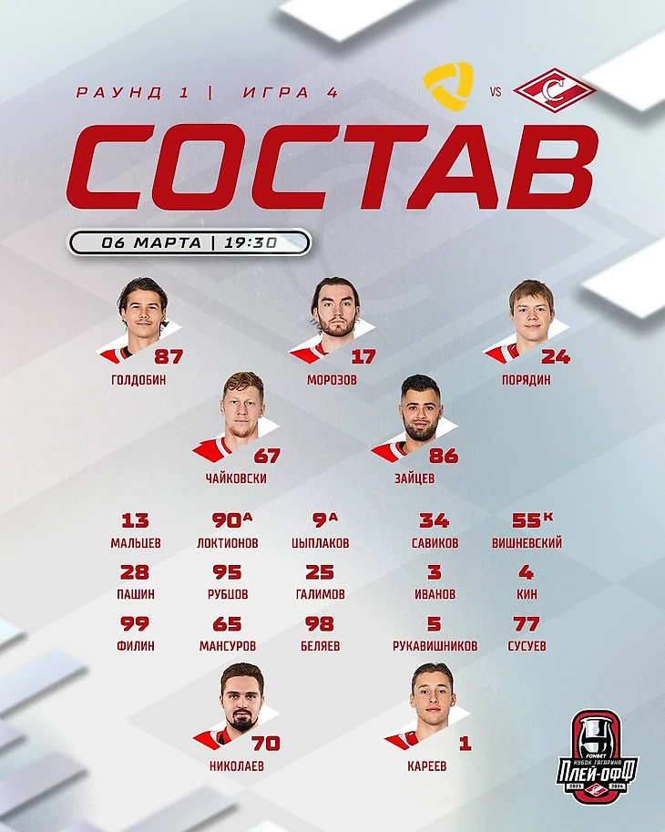 Тренерский штаб внес изменения в состав 👊 Изучаем 👀 ✅ Александр Жабреев, Всеволод Никитин, Михаил Тихонов, Андрей Чуркин, Дмитрий Моисеев ❌ Никита Коростелев, Марк Барберио, Давид Думбадзе, Никита Гуслистов, Кристиан Ярош