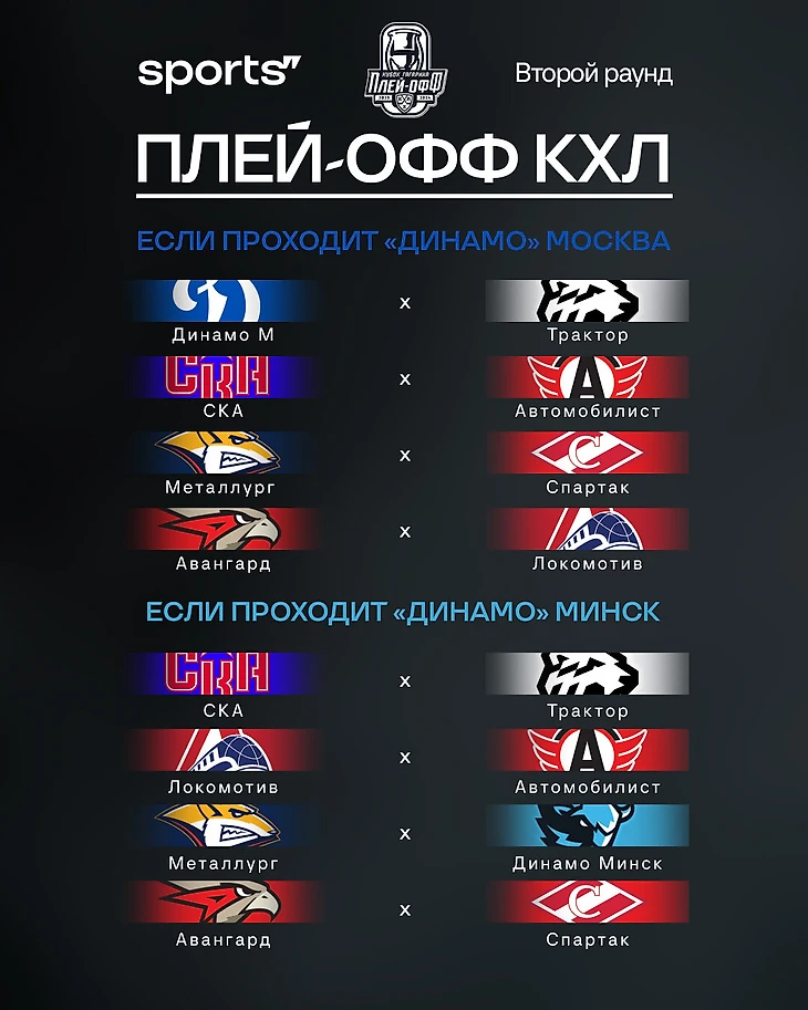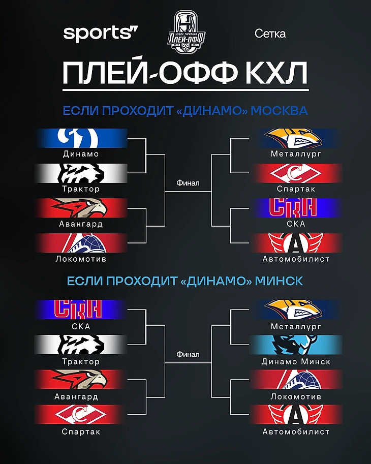 ● в случае выхода московского «Динамо» – «Динамо», либо «Трактор», либо «Авангард», либо «Локомотив» vs «Металлург» / «Спартак» / СКА / «Автомобилист»;