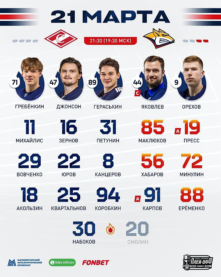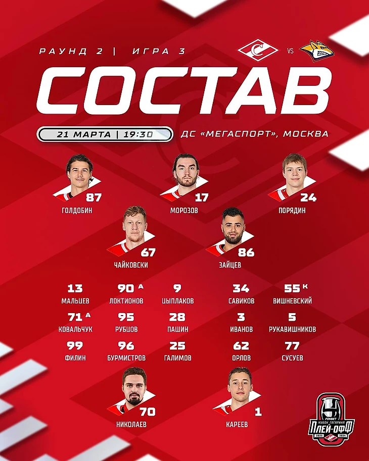 Состав красно-белых на третий матч серии 1/4 финала против магнитогорского Металлурга. По сравнению с прошлым матчем в состав вернулись Роман Рукавишников, Егор Филин и после долгого отсутствия сыграет Александр Бурмистров. Они заменили Джозефа Кина, Александра Беляева и Демида Мансурова.