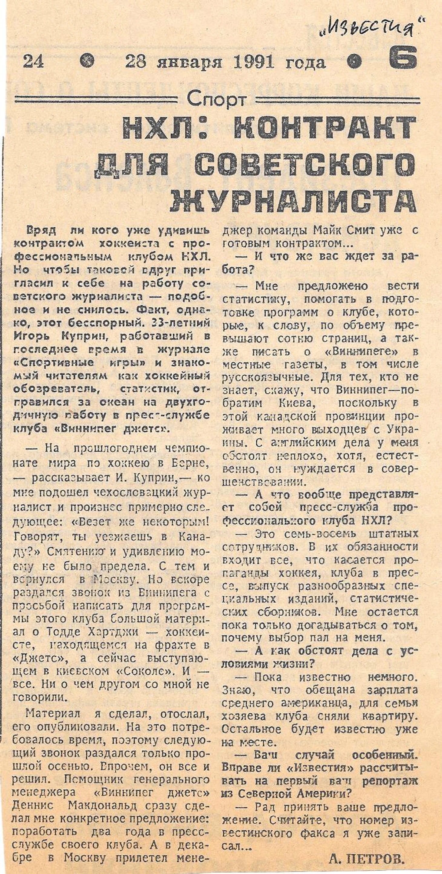 Дальше оформили документы и в конце января 1991-го я с семьей улетел в Виннипег."(с)