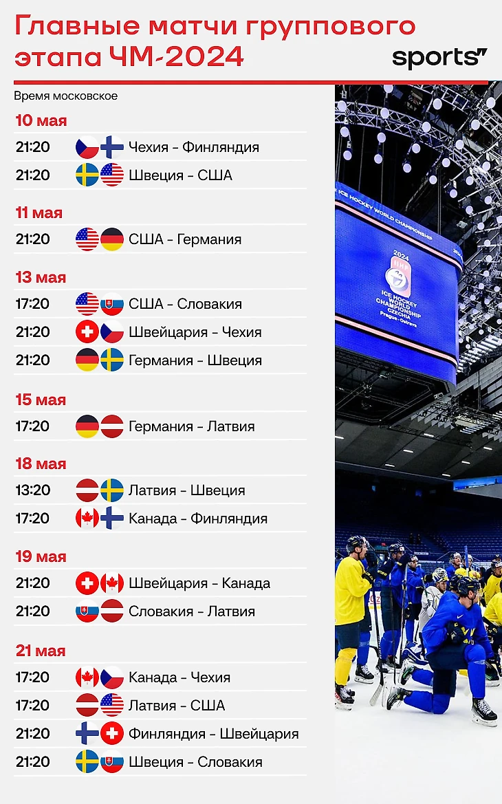Стартует турнир без раскачки: уже в первый день состоятся два интереснейших матча: Чехия – Финляндия и Швеция – США. В основном все самые интересные игры организаторы распределили на начало или завершающий день группового этапа. Все матчи можно посмотреть на каналах «Матч».