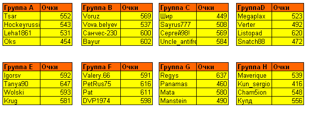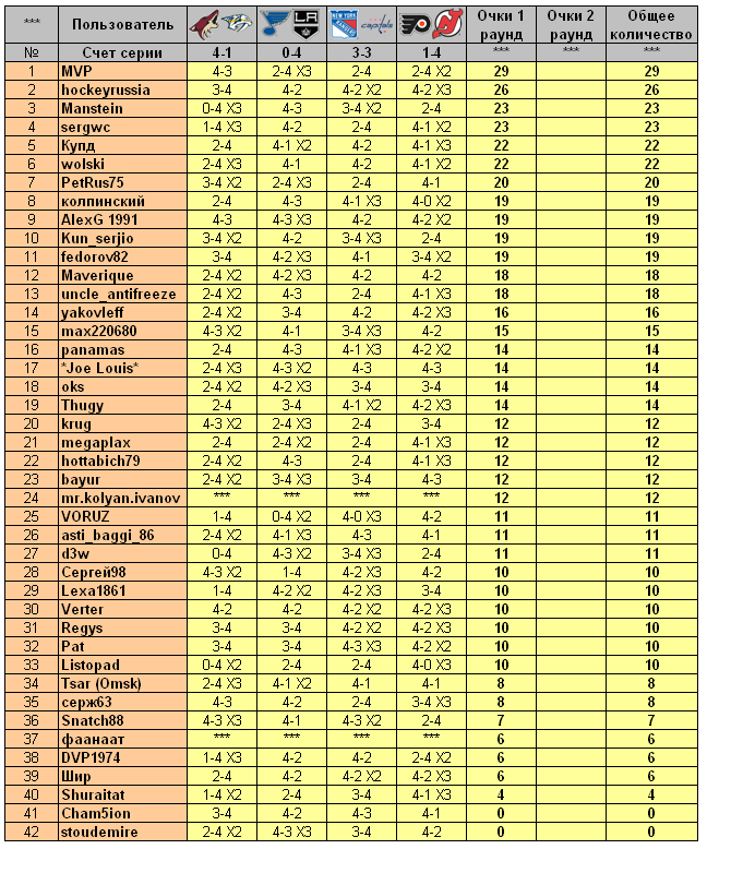 Пока еще я не подсчитывал количество очков набранных во втором раунде, чтобы не пересчитывать потом заново, после оставшейся игры. Но думаю вам будет интересно поглядеть на огромное количество промахов, правильные прогнозы можно пересчитать по пальцам одной руки. МВП не угадал счет, но пока правильно отгадывает победителей серий, возможно что в этом туре его никто не сможет его догнать. Странно, что при таком чутье на исходы в противостояниях его команда в фентези выступает пока не так успешно. Также отмечу правильно угаданный счет от Воруца в серии между Сент-Луисом и Лос-Анджелесом, который вдобавок еще и удвоен. Удивительная прорицательность! Двое участников первого раунда не делали прогнозов во втором, и наоборот, добавилось двое новых участников, которые не учавствовали в первом раунде.