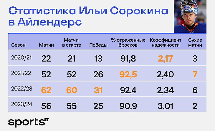 Каждый сезон Сорокин проводил лучше предыдущего. Такому прогрессу не мешал даже общий уровень команды. В сезонах-2021/22 и 2022/23 «Айлендерс» балансировали на грани попадания в плей-офф, но Илья все равно прибавлял и в итоге заслуженно стал стартером.