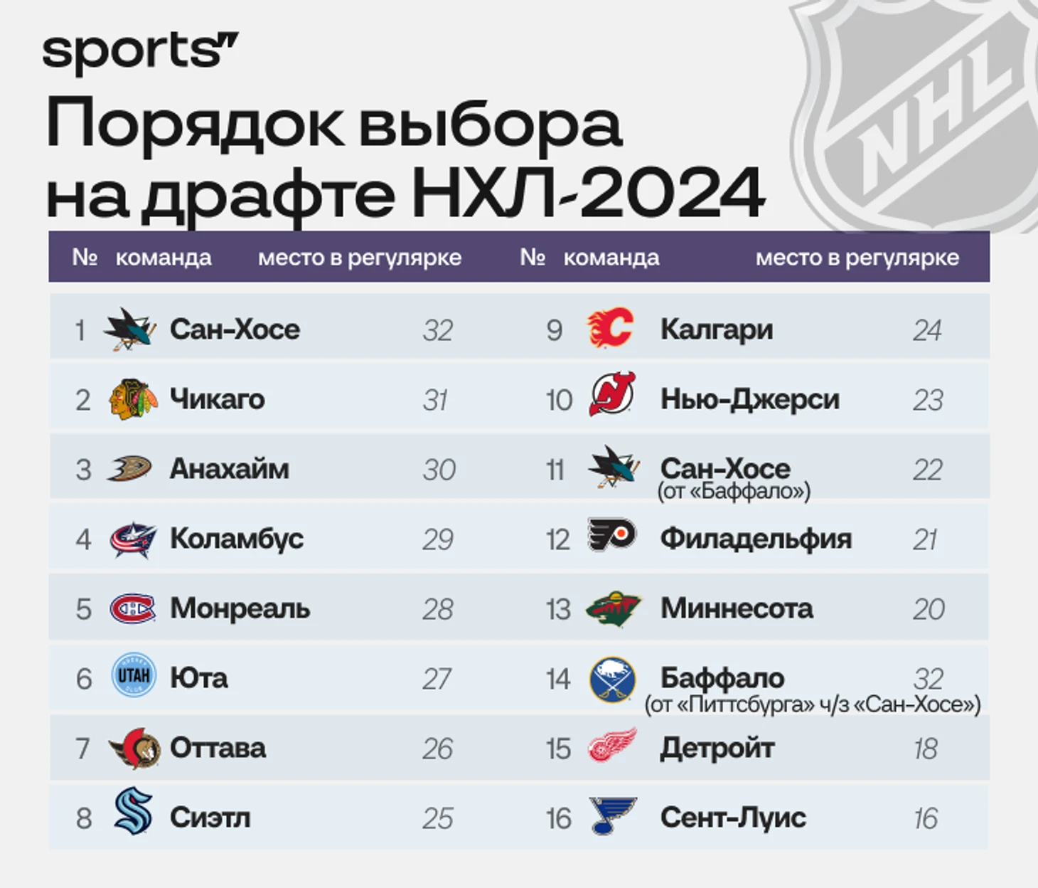 Драфт-лотерея церемонии-2024 состоялась еще в мае – и вообще оказалась без сюрпризов: выбирать будут в порядке от самого худшего клуба в регулярке к более успешным. А в результате предварительных обменов у «Сан-Хосе» будет два пика (у «Питтсбурга» – ни одного) – и «Шаркс» еще махнулись местами с «Баффало», который изначально после лотереи должен был выбирать 11-м.